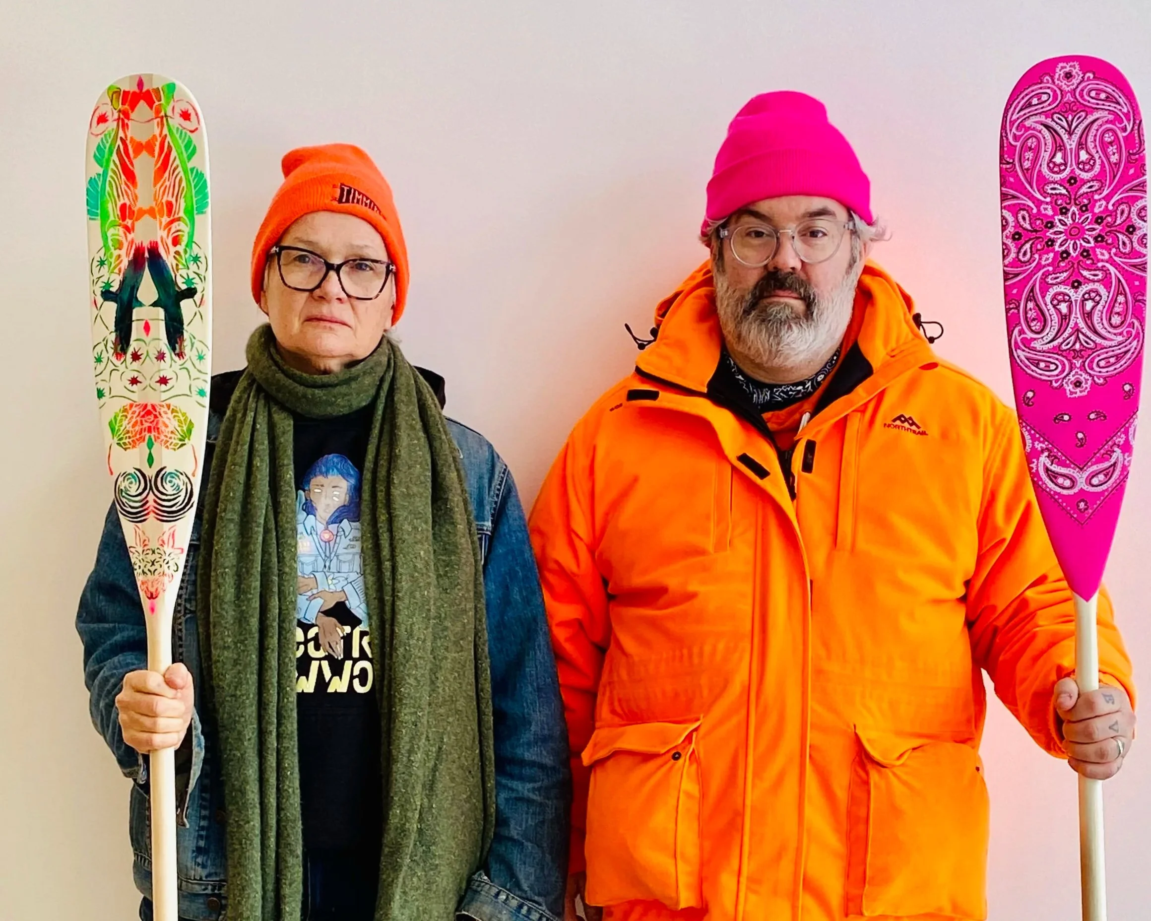 Mine, The Spanky Hanky Straddle Paddle, came together quickly and a little cheekily. I had a bandana with me, fresh off the heels of BARCODE, and that became the inspiration. A saturated fuchsia ground, bandana pattern translated directly onto the surface, the hanky code sitting visibly on an object tied to northern outdoor culture. Unplanned, but it fit. Some works know what they are before you do.